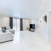 - Отделка стен и потолков: Стены покрыты декоративной штукатуркой Damask с эффектом «мокрого шёлка». Потолки — двухслойные из гипсокартона, армированные стеклохолстом, что гарантирует защиту от трещин даже спустя время.