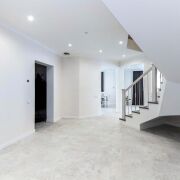 - Центральный элемент интерьера — монолитная лестница на второй этаж. Её ступени выполнены из крупноформатного керамогранита, перила из дуба с элементами ручной ковки.