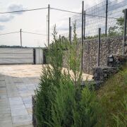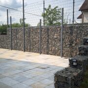 3. Подпорная стена и фронтальный забор из габиона (наполнение - гранит, обработанный лаком "мокрый камень").