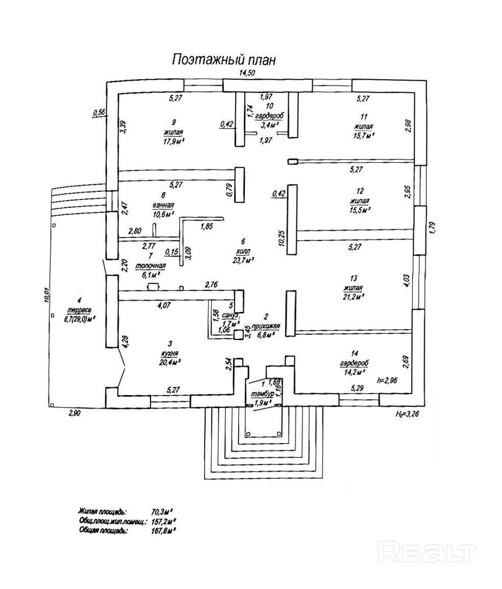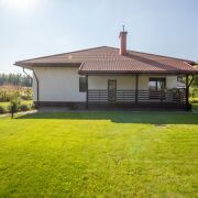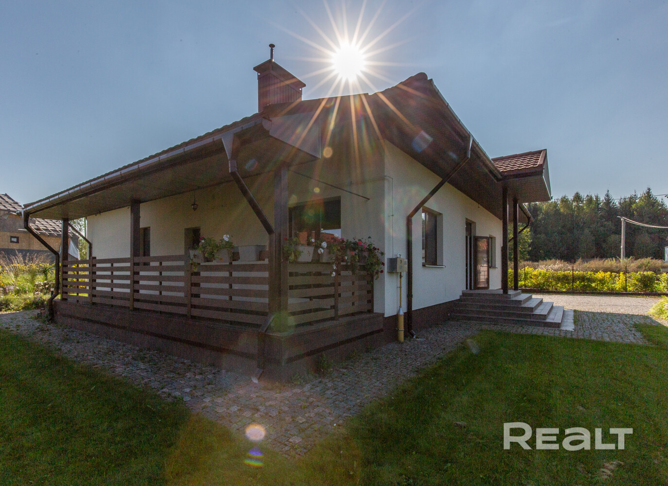 Дом одноэтажный, площадью по СНБ 167,8 кв.м. Построен по индивидуальному архитектурно-строительному проекту, с проверкой качества выполненных работ. Имеется вся документация по проектированию и текущему обслуживанию дома. Дом состоит из 4 жилых комнат, гардеробной, кладовой, кухни, топочной и 2 сан.узлов. Из кухни есть выход на просторную террасу (29 м2), обустроенную для отдыха на свежем воздухе и укомплектованную садовой мебелью, светильниками и уличными шторами для защиты от ветра и дождя. Есть возможность увеличения площади за счет мансардного этажа, где произведены все черновые работы, в том числе по выводу инженерных коммуникаций (электрика, сан.техника, отопление).