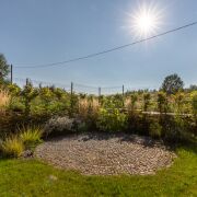 Профессиональный ландшафтный дизайн включает живую изгородь (грабы, пузыреплодник), взрослую ель, управляемую систему автополива газона и грядок, цветники с многолетними растениями. Система автополива снабжена датчиками дождя. Газон – ровный, ухоженный. Достопримечательность территории – взрослая ель (пушистая, высокая, правильной формы, с возможностью подстветки - отличное украшение, в том числе на новый год). Дорожки и площадка для авто вымощены гранитной брусчаткой.