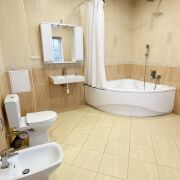 - Площадь 12 м2, оборудован угловой ванной, умывальником, унитазом и биде.