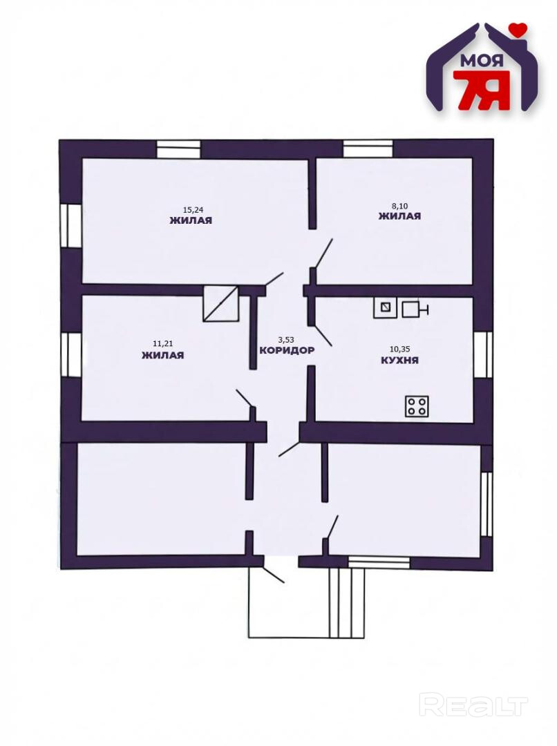 - Кирпичный дом 1984 года постройки, одноуровневый, общей площадью 48,4 м2. Крыша — шифер. Планировка простая и удобная для жизни без лестниц: три жилые комнаты (15,24 м2, 11,21 м2 и 8,10 м2) — можно распределить пространство под спальни, гостиную и кабинет, а просторная кухня 10,35 м2 остаётся тем самым местом, где действительно собираются, а не “проходят мимо”.