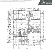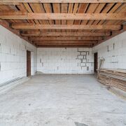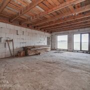 Согласно проекту вдоль дальней стены здания выделены две спальни размером по 22 м.кв с предусмотренными в них гардеробными площадью по 4.1 м.кв. , с общим для комнат санузлом площадью 6.2 м.кв. Там же расположена еще одна комната площадью 14.9 м.кв, которая имеет вход из большой гостиной (57.6 м.кв) и может использоваться как еще одна спальня или кабинет. Гостиная расположена в центральной части дома, имеет панорамное остекление и выход на террасу. Смежно с ней выделена еще одна спальня, площадью 28.2 м.кв с предусмотренным отдельным с/у (5.7 м.кв) и гардеробом (7.1 м.кв). Кухня имеет площадь 16.1 м.кв. Гараж размером 7х8 метром предусмотрен в фронтальной части здания для удобства использования. Высота потолков в комнатах более 3 метров. Осуществлена разводка канализации по всем зонам.