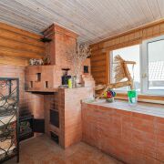 В беседке выложена печь-барбекю, стол и лавки из цельной древесины, стены из бруса, кровля-металлочерепица.