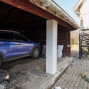 Удобно расположенный на въезде навес для машины, оборудованный местом для хранения нужных объемных вещей, садового инвентаря.