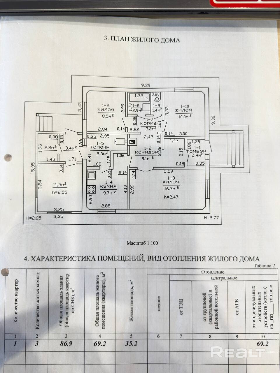 Дом 2007 года постройки, состоит из 3-х жилых комнат ( 16,7/10,0/8,5), кухни (9,7), коридора (9,1), топочной, мансардной (летней комнаты -11,5) и кладовой (2,8), сан.узел раздельный (2,9/1,4), два входа с тамбурами (3,4/2,4). Дом построен из ж/б панелей, кровля -м/черепица. В доме все коммуникации, туалет, ванная комната, газовое отопление, горячая вода, электричество, центральный водопровод и центральная канализация, интернет, телефон.
