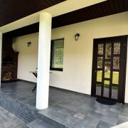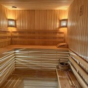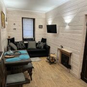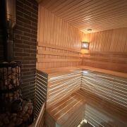 - гостевой дом, в котором есть комната отдыха с камином и мягкой мебелью, оборудованная кухня, санузел и самое главное – отличная сауна, душ и традиционная кадка с холодной водой. Отделка натуральное дерево, плитка, теплый пол. Снаружи терраса с барбекю зоной.