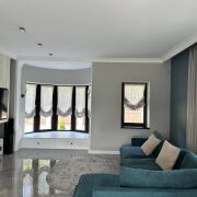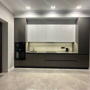 На окнах римские шторы и портьеры двух видов: легкий прозрачный тюль и шторы. В гостиной легкая белая корпусная мебель, удобный ортопедичсекий диван. Встроенная кухня со встроенной техникой.
