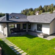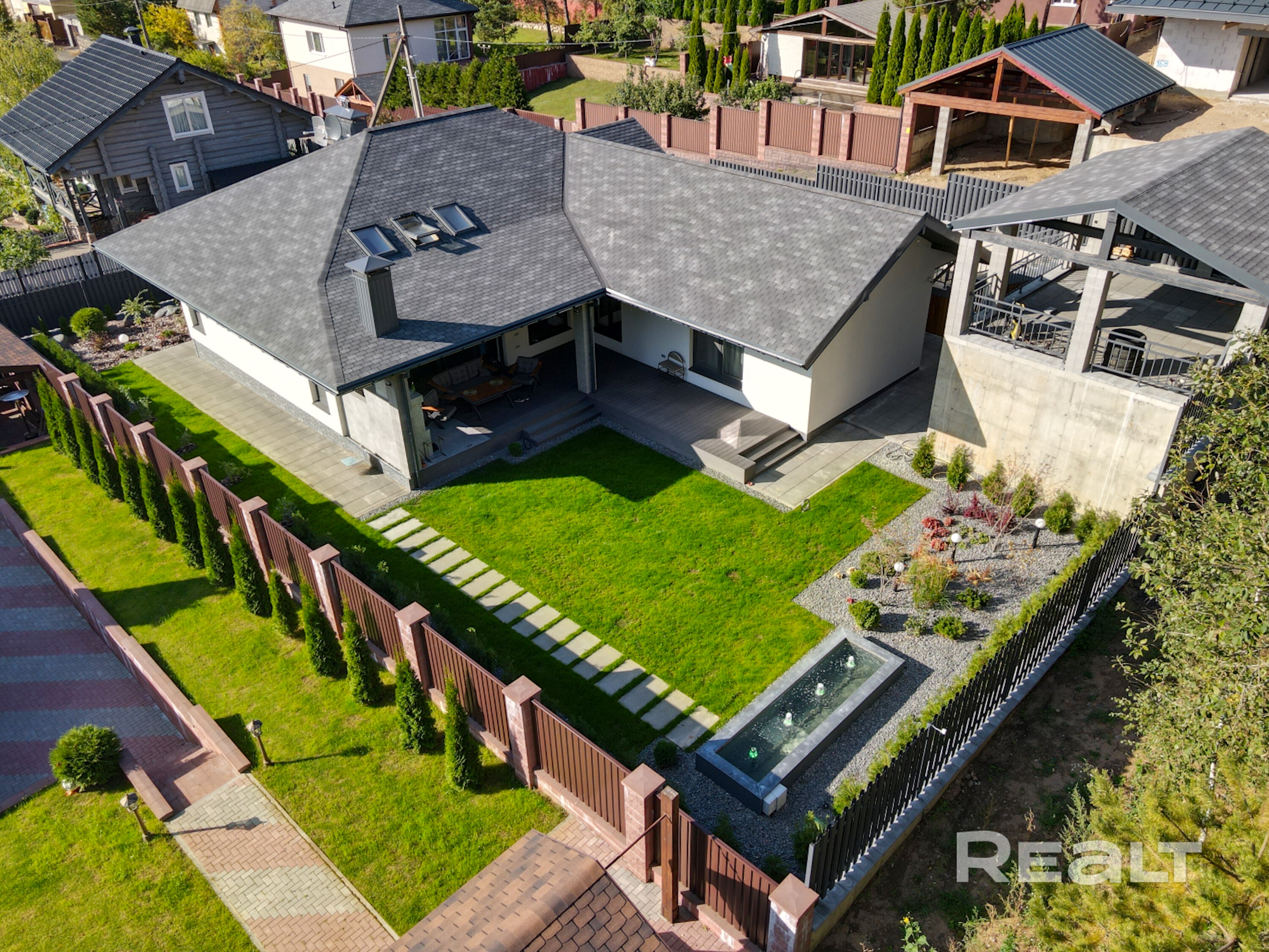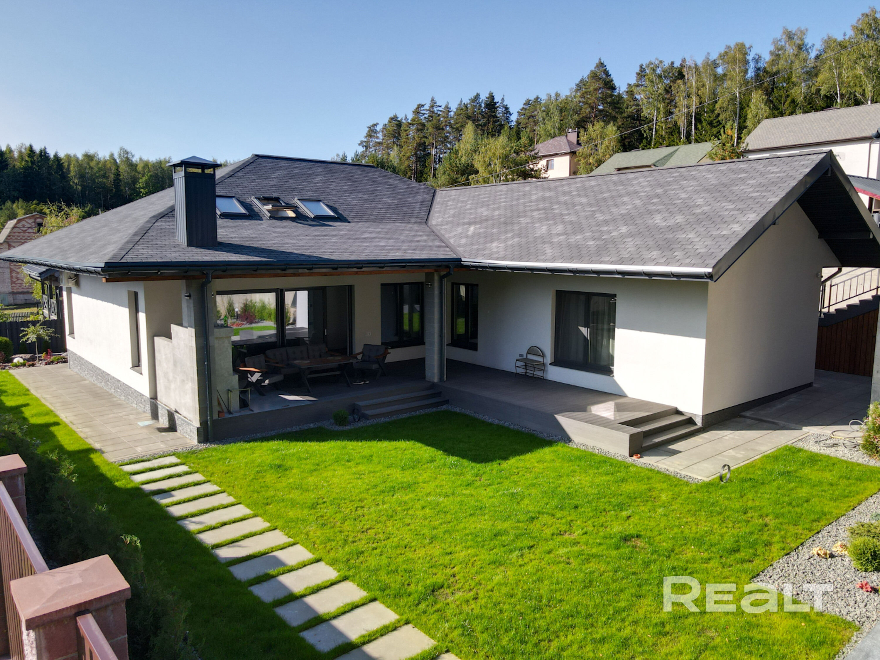 Дом в один уровень. Площадь застройки 213 м. кв., с учётом террасы. Видеонаблюдение по периметру участка.