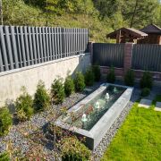 Чистый воздух, запах хвои, декоративный пруд с фонтанами и подсветкой, терраса. Ландшафтный дизайн с разбивкой на два уровня.