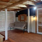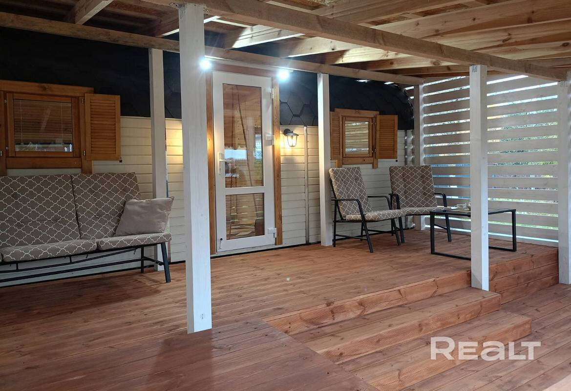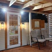- Отделка: Все деревянные поверхности внутри и снаружи обработаны качественной защитной пропиткой и покрыты износостойким бесцветным матовым лаком или краской по дереву. Террасная доска также обработана немецким маслом и окрашена.