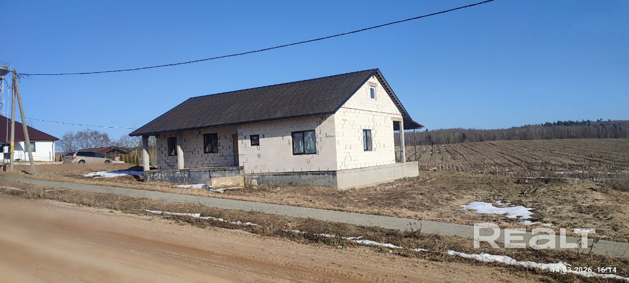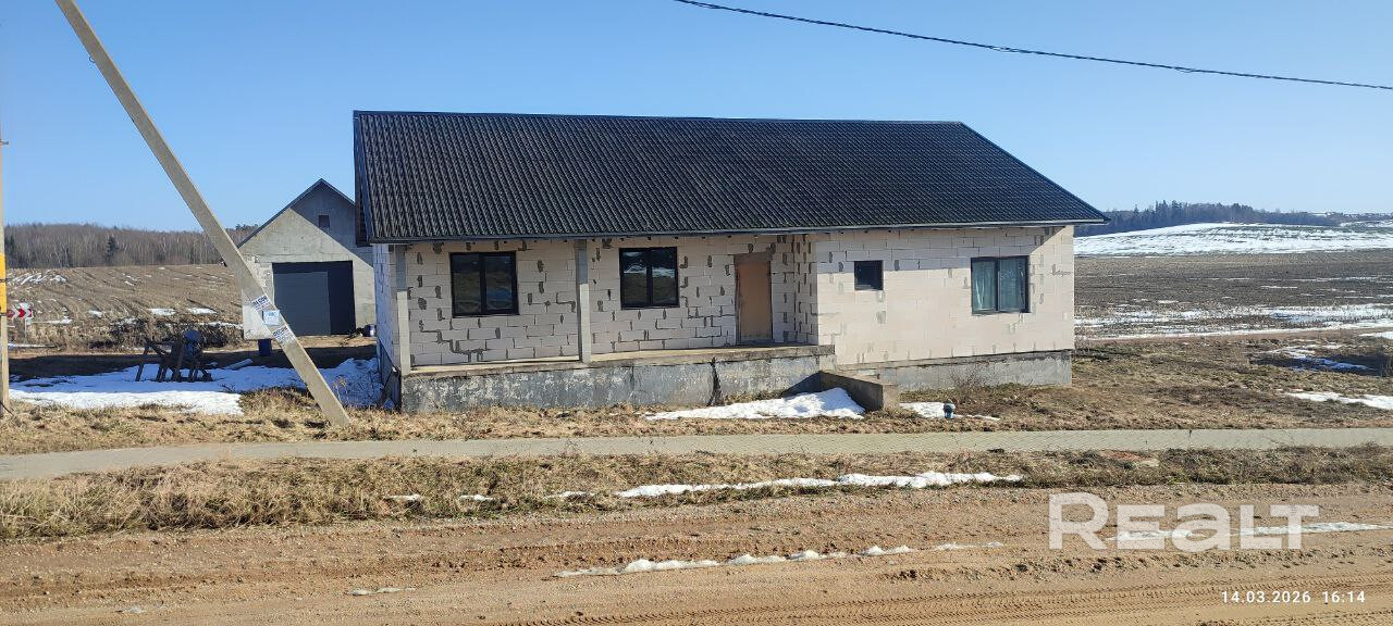 Недалеко от Минска продаётся дом (незавершённое законсервированное капитальное строение). Участок 15 соток рядом с полем. Одноэтажный дом с террасой площадью 180 кв. Есть гараж.