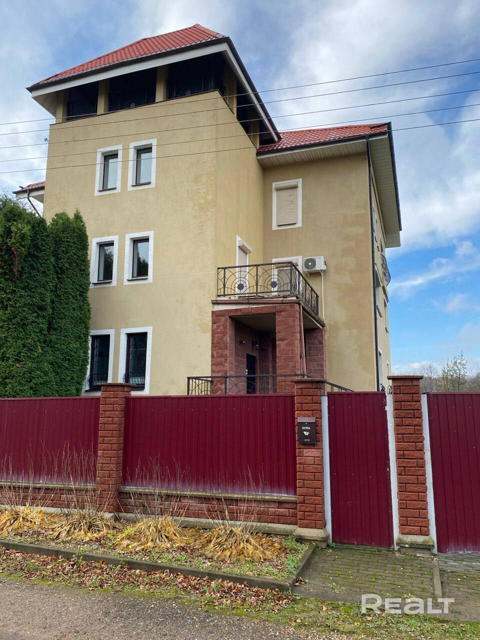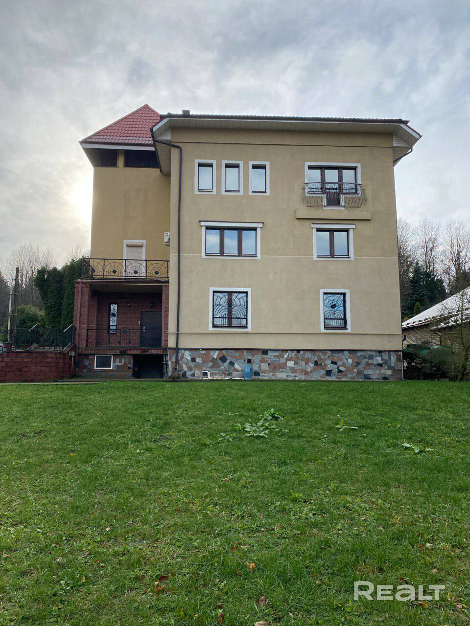 Характеристики объекта · Площадь дома: 668,3 м² (жилая 194,7 м²) · Стены: кирпич 0,5 м (отличная тепло‑ и шумоизоляция) · Этажность: 3 этажа · Коммуникации: центральное водоснабжение, местная канализация, новое газовое отопление (2023) · Удобства: 5 санузлов, 3 камина, сауна, бассейн, гараж, дубовый паркет, отапливаемый цоколь · Участок: 25 соток, ровный, огорожен, удобный подъезд с трёх сторон · Расположение: 24 км от МКАД (Минск), 800 м до Дубровского водохранилища, рядом «Раубичи», «Логойск»