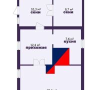 - Планировка дома состоит из одной жилой комнаты открытого пространства – 29,6 м2, двое сеней 10,9 м2 и 9,7 м2, прихожей 12,4 м2 и кухни 7,6 м2, где принимать гостей будет одно удовольствие.
