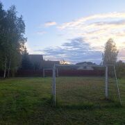 Кроме коттеджа на участке имеется хоз.помещение, в котором находится подвал, беседка с качелями и зоной очага, а также организовано небольшое футбольное поле для мини футбола со стационарными воротами.