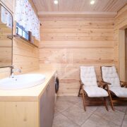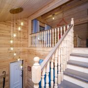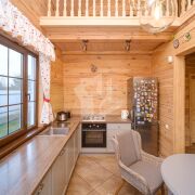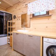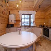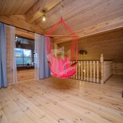 В доме выполнен качественный ремонт, пространство зонировано: открытая просторная терраса с обеденной группой с видом на газон и лес; кухня-столовая, оборудованная всей необходимой бытовой техникой европейских производителей с выходом на террасу и кладовкой; гостиная со вторым светом и тёплой атмосферой, спальная комната с сан. узлом. На первом этаже также есть электрическая сауна с комнатой отдыха, душем и выходом на задний дворик. На втором этаже расположена просторная спальня с сан.узлом, комната отдыха с качелями с видом на участок и лес, кладовые.
