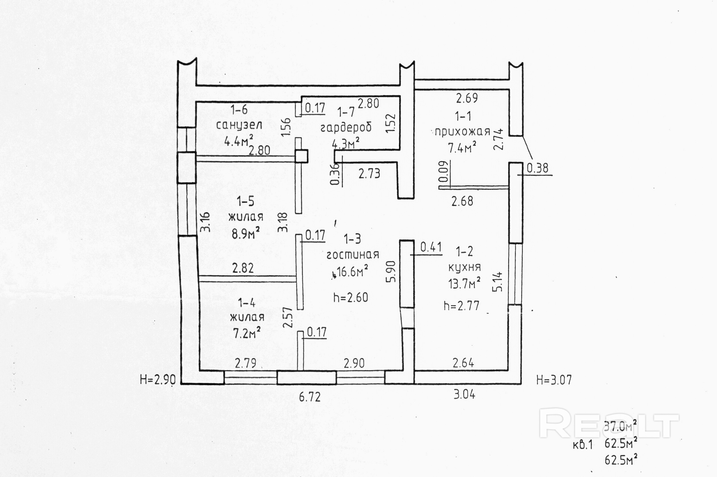 Площадь: Общая – 63 м; Жилая – 37 м; Кухня – 13.7 м; Гардеробная – 4.3 м; Санузел – 4,4 м; Прихожая – 7.4 м;