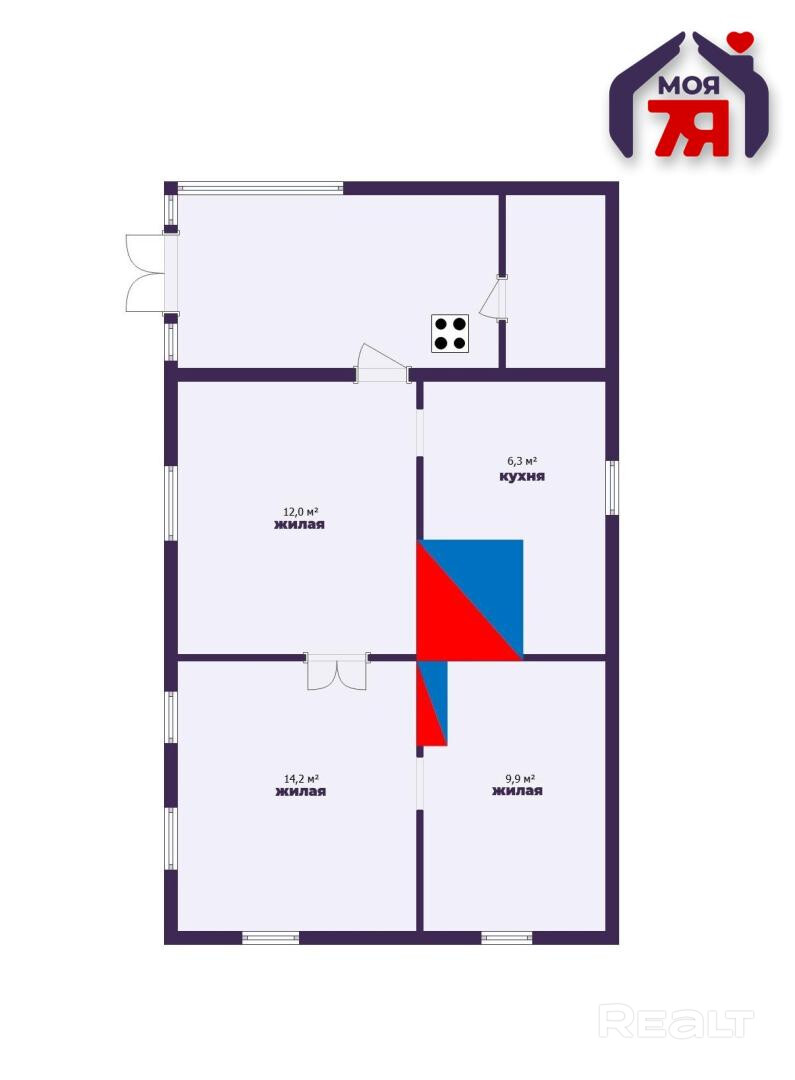- Дом состоит из трех комнат: первая комната площадью 14,27 м2, вторая — 12,0 м2, третья — 9,92 м2. Планировка позволяет удобно разместить всю семью, каждый получит личное пространство.