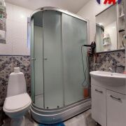 - Совмещенный санузел с душевой кабиной облицован плиткой, что обеспечивает легкий уход и аккуратный вид.