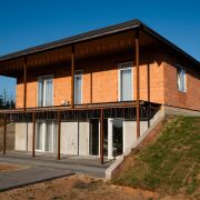 Над главным входом в дом по всей ширине навес, являющийся террасой для второго этажа. На первом этаже расположены: холл, три двери в пять подсобных помещений (гостевой санузел, душевая + сауна + хоз. помещение, гардеробная/прачечная) объединенная кухня, столовая и гостинная, а также лестница на второй этаж. На втором этаже: холл (предполагался видеозал с проектором), четыре спальни (три из которых имеют свои выходы на террасу) и санузел с ванной.