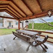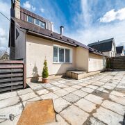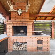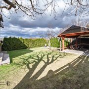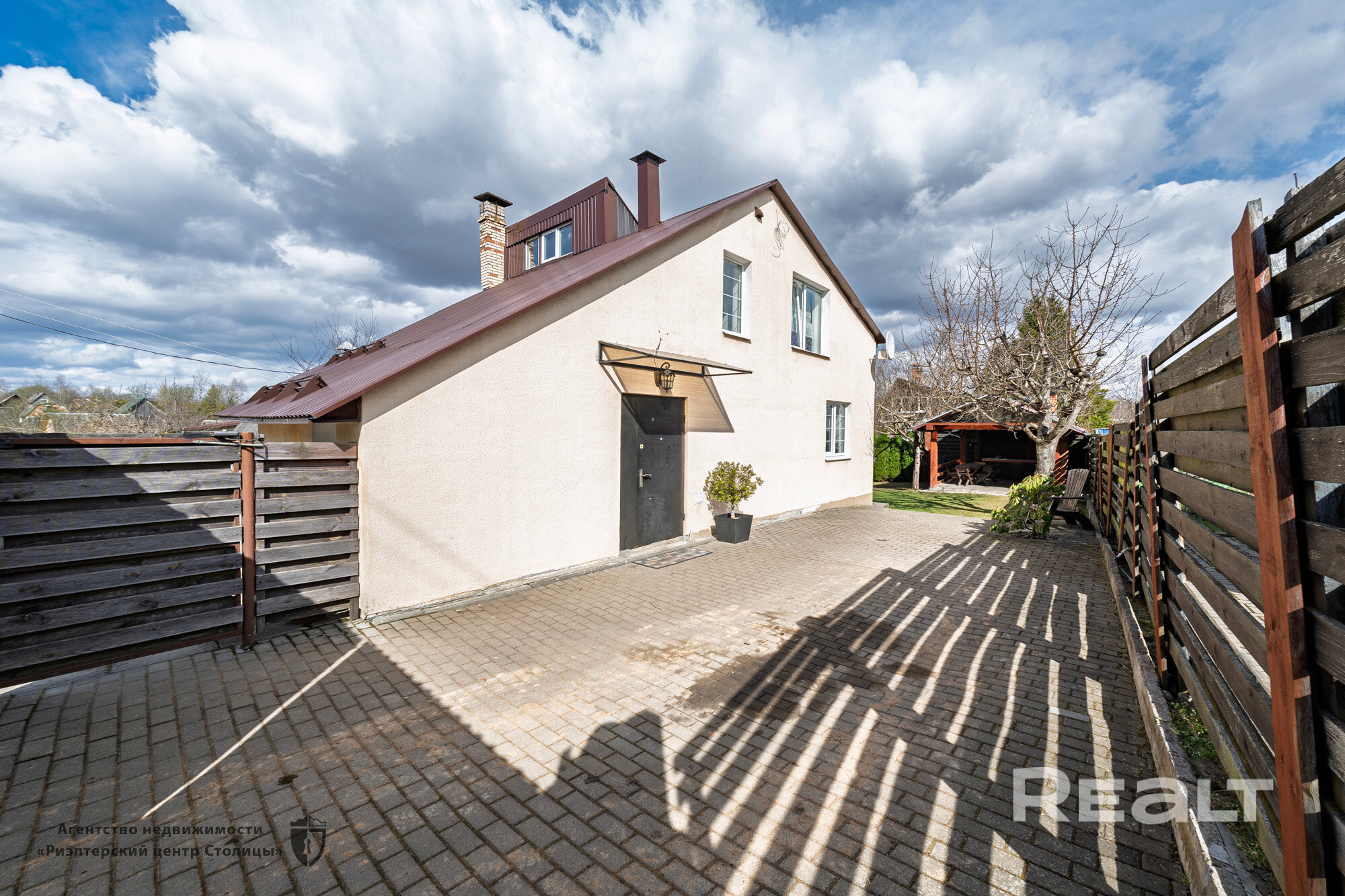 Земля 4,34 сотки в частной собственности, огорожена забором. Перед домом удобная парковка на 2 автомобиля. Зона отдыха оборудована с комфортом: беседка с печью и мангалом, мощёная площадка под бассейн, зелёные изгороди по двум сторонам двора. На участке растут три яблони и черешня. Из кухни предусмотрен отдельный выход в сад прямо к беседке.