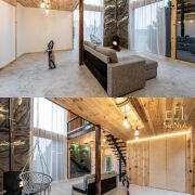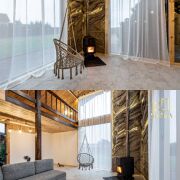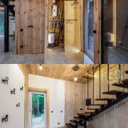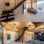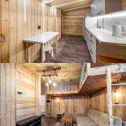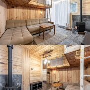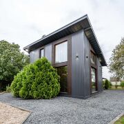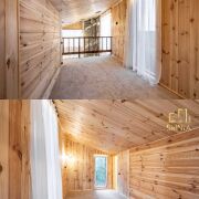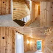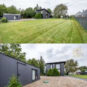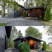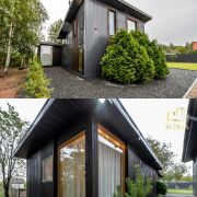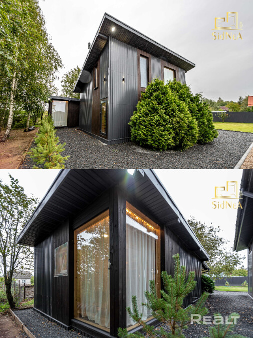 Основной дом 6х8 метра в 2 уровня. С большим панорамным остеклением и высотой потолка до 5,5 метра.