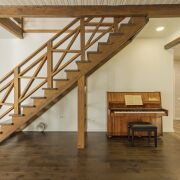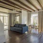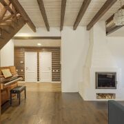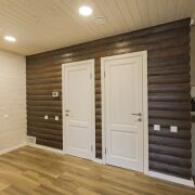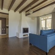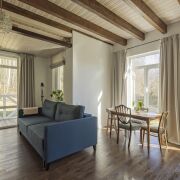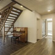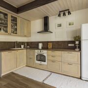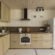 Первый этаж: гостиная-столовая с камином и выходом на террасу с видом на лес; кухня, где помимо варочной электро-панели и духового шкафа есть печь для приготовления натуральной вкусной еды. Кухонная мебель из фанеры – большая редкость на рынке (дорого, качественно, натурально). В идеальном состоянии. Кабинет. Прихожая с гардеробом. Раздельный санузел;