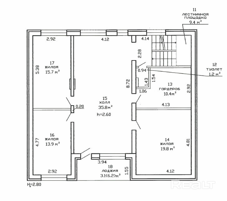 2-й этаж: 3 просторные комнаты(15,7м, 13,9м, 19,8м), , большой холл 38,8м и гардероб 10,4м, лоджия 6,2м