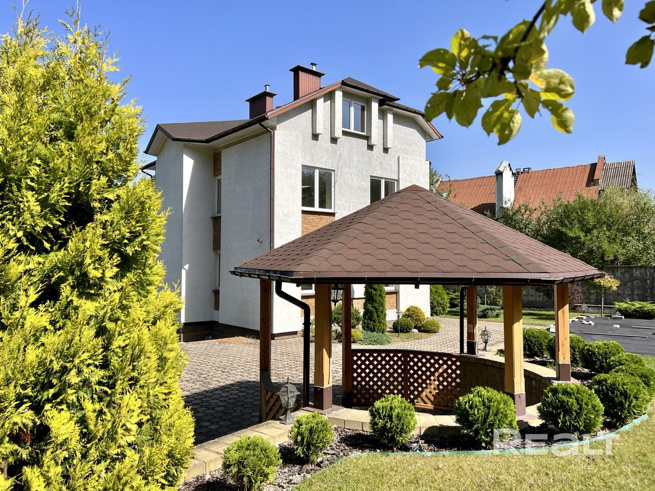 Материал стен (блоки и кирпич) оштукатурены " Короедом ", декоративная отделка камнем, лестница облицована плиткой, перила ковка, окна ПВХ «SALAMANDER», мягкая кровля «KATEPAL», установлена сигнализация, видеокамеры, видеодомофон; ворота металлопрофиль открываются с пульта, гостевая парковка и гараж так же с пульта + кодовый замок на калитке; автополив по всей территории участка, фонари.