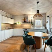 -Первый этаж организован функционально и красиво. Прихожая встречает гостей. Просторная гостиная‑кухня становится сердцем дома — местом, где собирается семья.