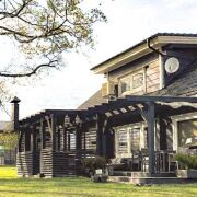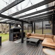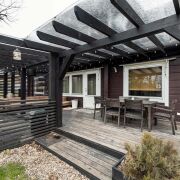 -К дому пристроена большая терраса, ставшая продолжением пространства кухни- гостиной. На террасе организована полноценная зона барбекю: мангал для шашлыков, печь под казан для аутентичных восточных блюд, рабочая зона для готовки, мойка с подведённой водой. На полу террасная доска из лиственницы — долговечность и красота. Обеденная зона позволяет собираться за столом на свежем воздухе, наслаждаясь природой. Или отдыхать на массивном мягком диване рядом.