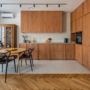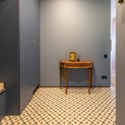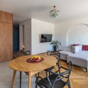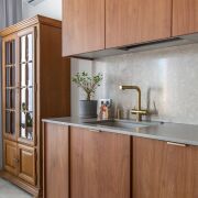Винтажные итальянские бра и зеркало у входа. Консоль из массива дуба. Большой встроенный шкаф с подсветкой и зонами для взрослых и детей, а также антресолью. Постирочная выполнена из газосиликатных блоков и оборудована окошками. Здесь установлены стиральная и сушильная машины, а также встроенная компактная гладильная доска. Светлая и уютная кухня-гостиная оборудована навесной и встроенной мебелью с бытовой техникой: варочная панель, духовой шкаф, посудомоечная машина, холодильник. В умывальник встроен измельчитель пищевых отходов. Из гостиной есть выход на террасу.