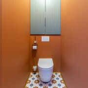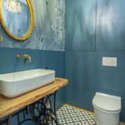 Санузел первого этажа - винтажный свет и дизайнерское подстолье со столешницей из натурального дерева. Смесители – производство Италия.