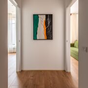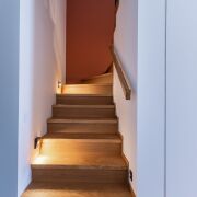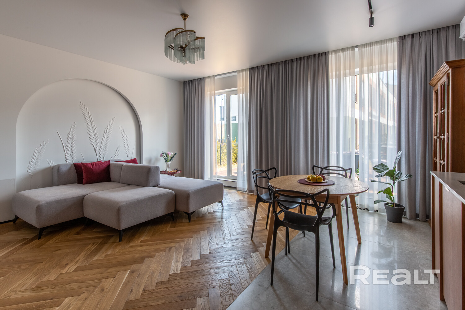 Под лестницей оборудована вместительная и удобная кладовая. Полы первого этажа - плитка и паркет. Есть теплые полы. В гостиной — авторский барельеф от белорусского декоратора и диван, созданный по индивидуальному заказу. Винтажный свет и буфет. Лестница выполнена из бетона, ступени отделаны шпоном.