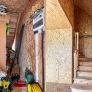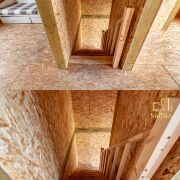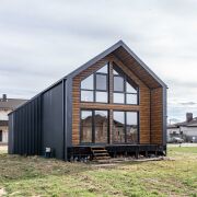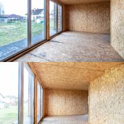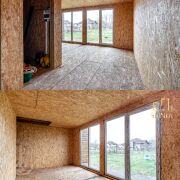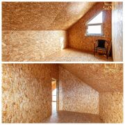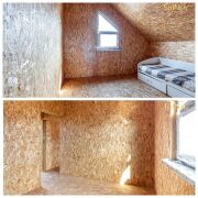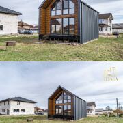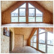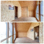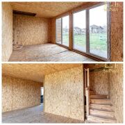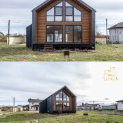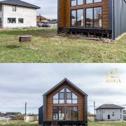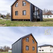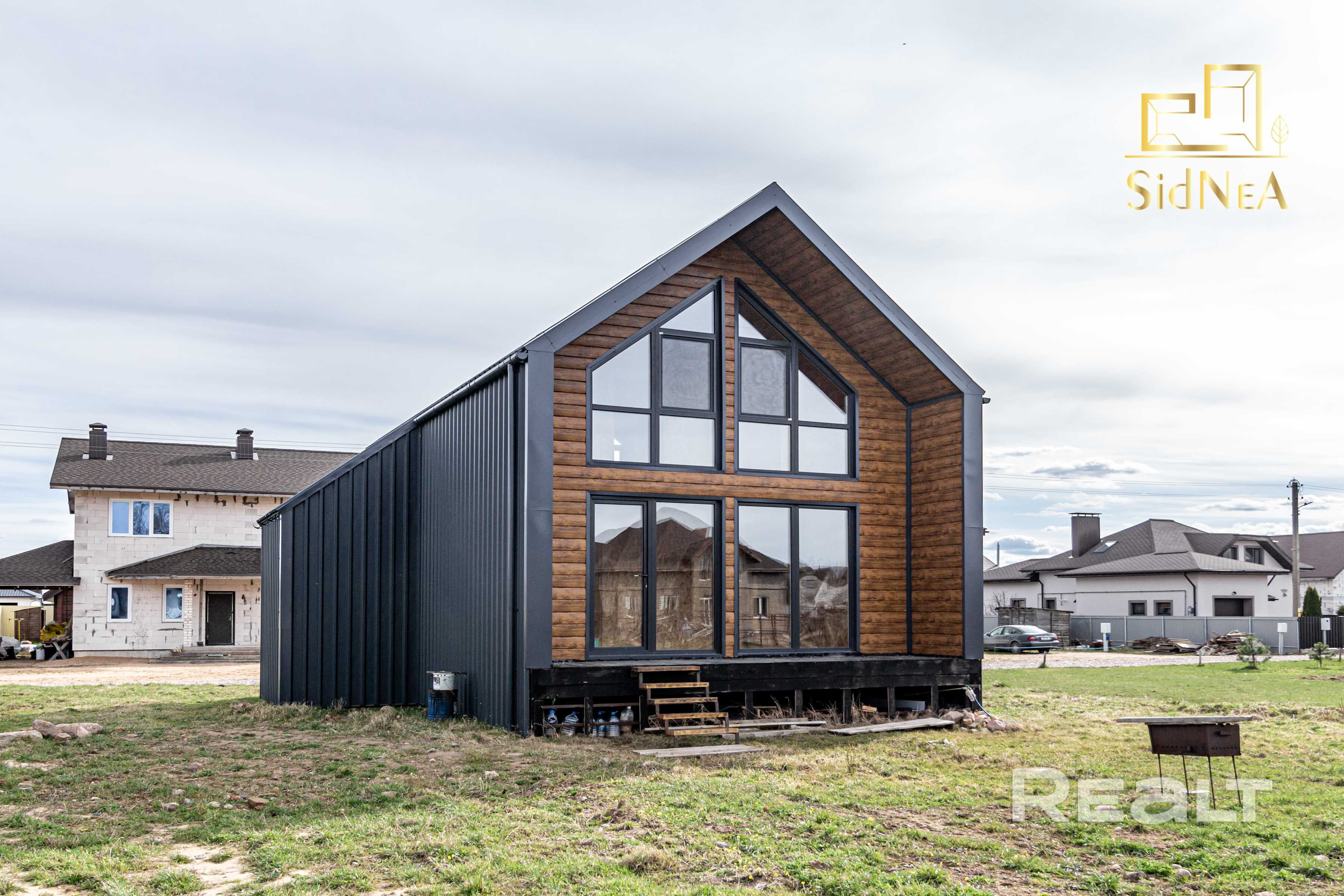 Стены: СИП панели, наружная отделка металлопрофилем цвет графит и королевский дуб.