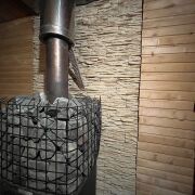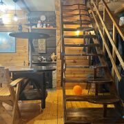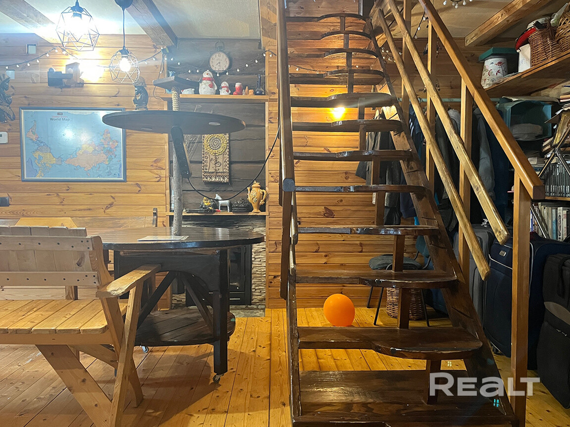 Первый этаж: веранда-прихожая, гостиная, столовая и кухня объединены в общее пространство. Камин. Также на 1 этаже находится кабинет, санузел,  душевая, большая парилка с печью на дровах, котельная.