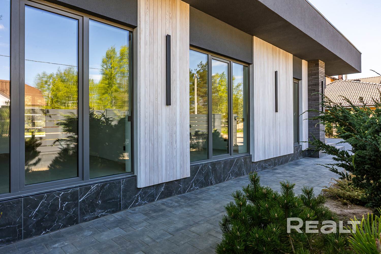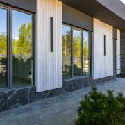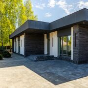 -Стены из блоков 400 мм с утеплением каменной ватой 50 мм. Внешняя отделка клинкерный кирпич и лиственница.