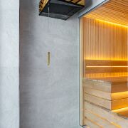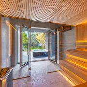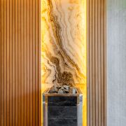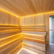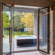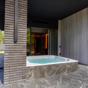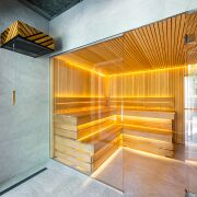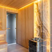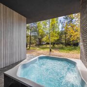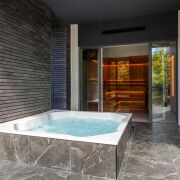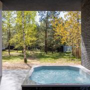 В правой части дома расположилась четвёртая комната 20 м, она может быть комнатой отдыха, гостевой, игровой, кабинетом или спальней. Из неё попадаем в спа-зону с душевой, просторной сауной и горячей купелью-джакузи на улице.