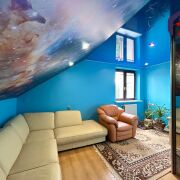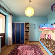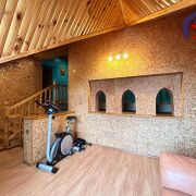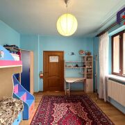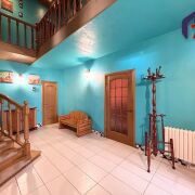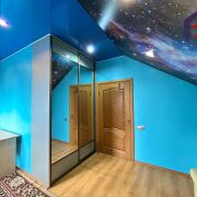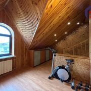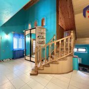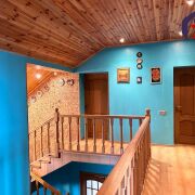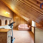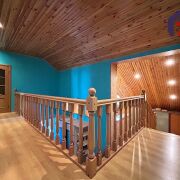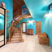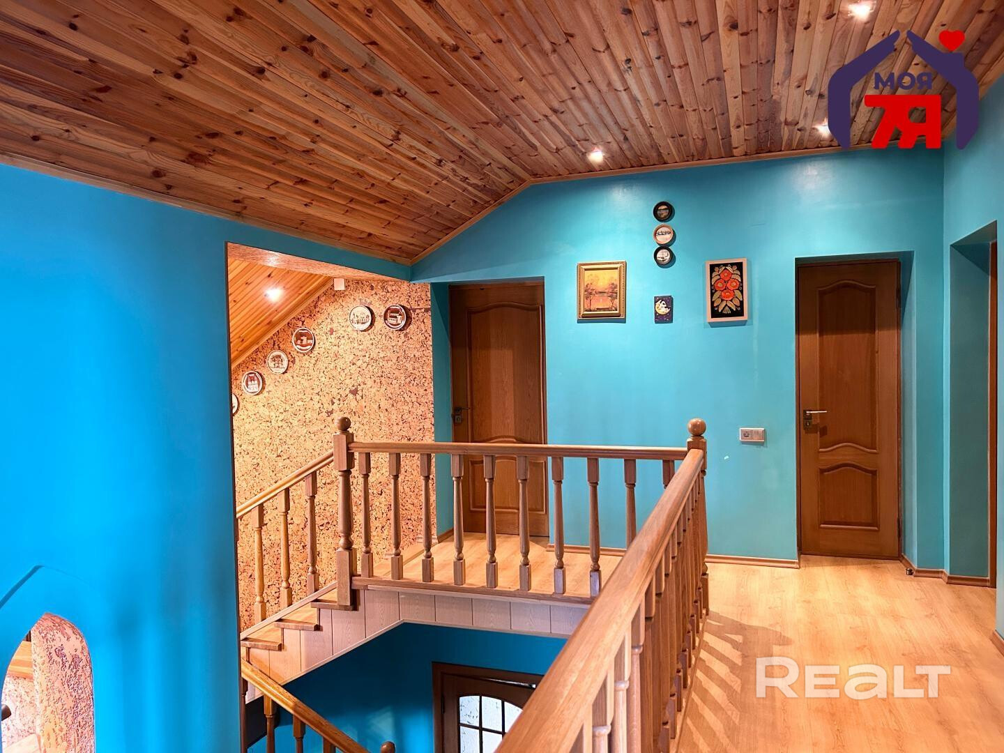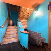 - Верхний этаж впечатляет своей отделкой: потолок обшит натуральным деревом с точечным освещением, стены окрашены в бирюзово-голубой цвет, создавая ощущение лёгкости и свежести. Деревянная лестница с перилами и пробковой панелью как декоративный акцент гармонирует с дверями из массива тёмного дерева. Ламинат тёплого медового оттенка согревает ноги и взгляд.