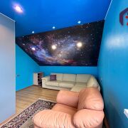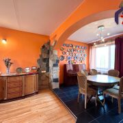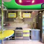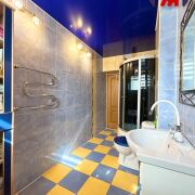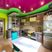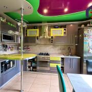 - Интерьер поражает современным и ярким дизайном. Просторная кухня площадью 12,2 м2 – сердце дома – отделана яркими стенами и потрясающим многоуровневым натяжным потолком, украшенным встроенным точечным освещением. Функциональный тёмно-серый гарнитур с жёлтыми акцентами, встроенная техника из нержавеющей стали (газовая плита, вытяжка, микроволновка). Керамическая плитка бежево-песочного оттенка на полу, барная стойка с хромированной опорой – всё продумано для удобства и уюта.