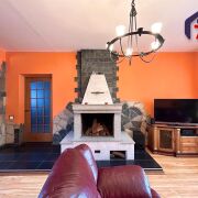 - Гостиная с камином – главная комната для семейных встреч и отдыха. Центральный элемент – традиционный камин из белого кирпича и тёмного камня – становится фокусом внимания, излучая уют и комфорт. Люстра с коваными чёрными элементами и мягким светом, деревянная ТВ-тумба классического дизайна, тёмно-красный кожаный диван дополняют образ. Полы комбинированы: тёмная плитка вокруг камина и тёплый ламинат в остальной части, большое окно наполняет комнату светом и свежестью.