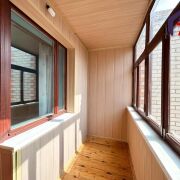 - Застеклённые открытые и закрытые лоджии предоставляют приватное пространство для отдыха. Застеклённая часть с деревянной отделкой панелями, тёмно-коричневыми окнами и ламинатом создаёт уютную зону для любой погоды, открытая лоджия – место для свежего воздуха с видом на благоустроенный район.