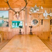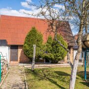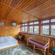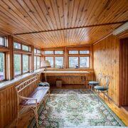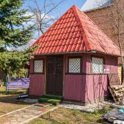 - На ровном участке 17 соток расположены летняя веранда, баня с комнатой отдыха на втором этаже, теплица, хоз. постройки.
