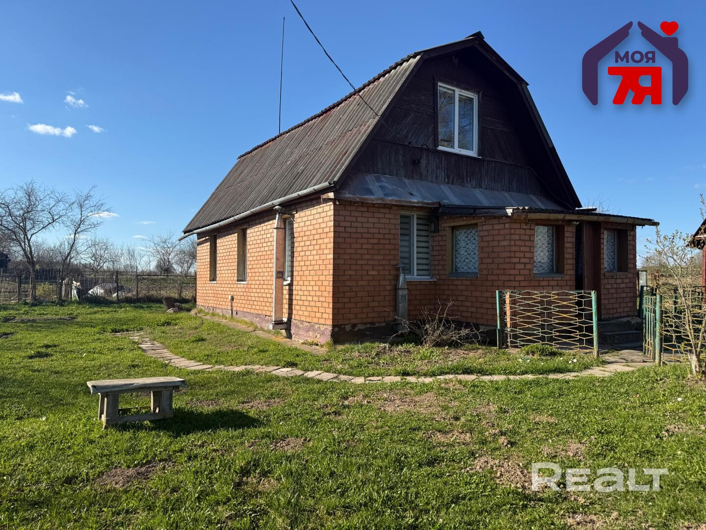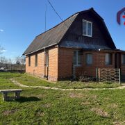 -Двухэтажный бревенчатый дом, облицованный кирпичом, с жилой пристройкой общей площадью 47,5 м2  расположен на возвышенности, что гарантирует отсутствие застоя влаги на участке.
