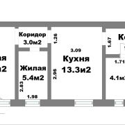 Три комнаты: 10,6м2, 14,3м2, 5,4м2 и кухня 13,3м2.