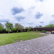 На участке ухоженный газон, многолетние деревья и кустарники, ограждён забором, откатные ворота, асфальтированные подъездные пути.
