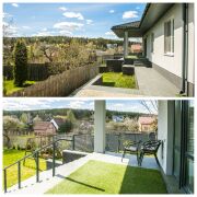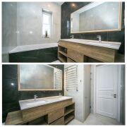 Коттедж для круглогодичного проживания. Газосиликатные блоки (оштукатурены, окрашены). Свайно-ростверковый фундамент. Металлочерепица (Финляндия). Котёл Bosch (одноконтурный). Сантехника и тёплые полы по всему периметру Wavin. Радиаторы отопления. Ванна с гидромассажем, каменные столешницы. Техника Siemens, кондиционер Electrolux инверторный. Двери-массив. Потолки — Feriсo, стены окрашены. Видеонаблюдение, автоматич. ворота. Канализация местная (6 колец, по 1.5 м каждое).