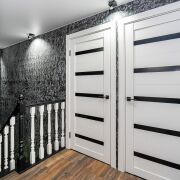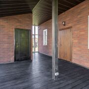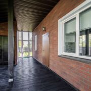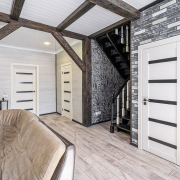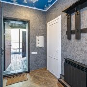 Входная группа – просторная застекленная терасса. Входная дверь в дом – металлическая + деревянная. В коридоре установлен большой шкаф-купе.