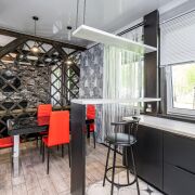 Кухонная зона с современным оборудованием (холодильник, электрические варочная поверхности и духовой шкаф, МКВ-печь), обеденная зона и зона отдыха. Здесь же находятся спальная комната и санузел с современной и качественной душевой кабиной.